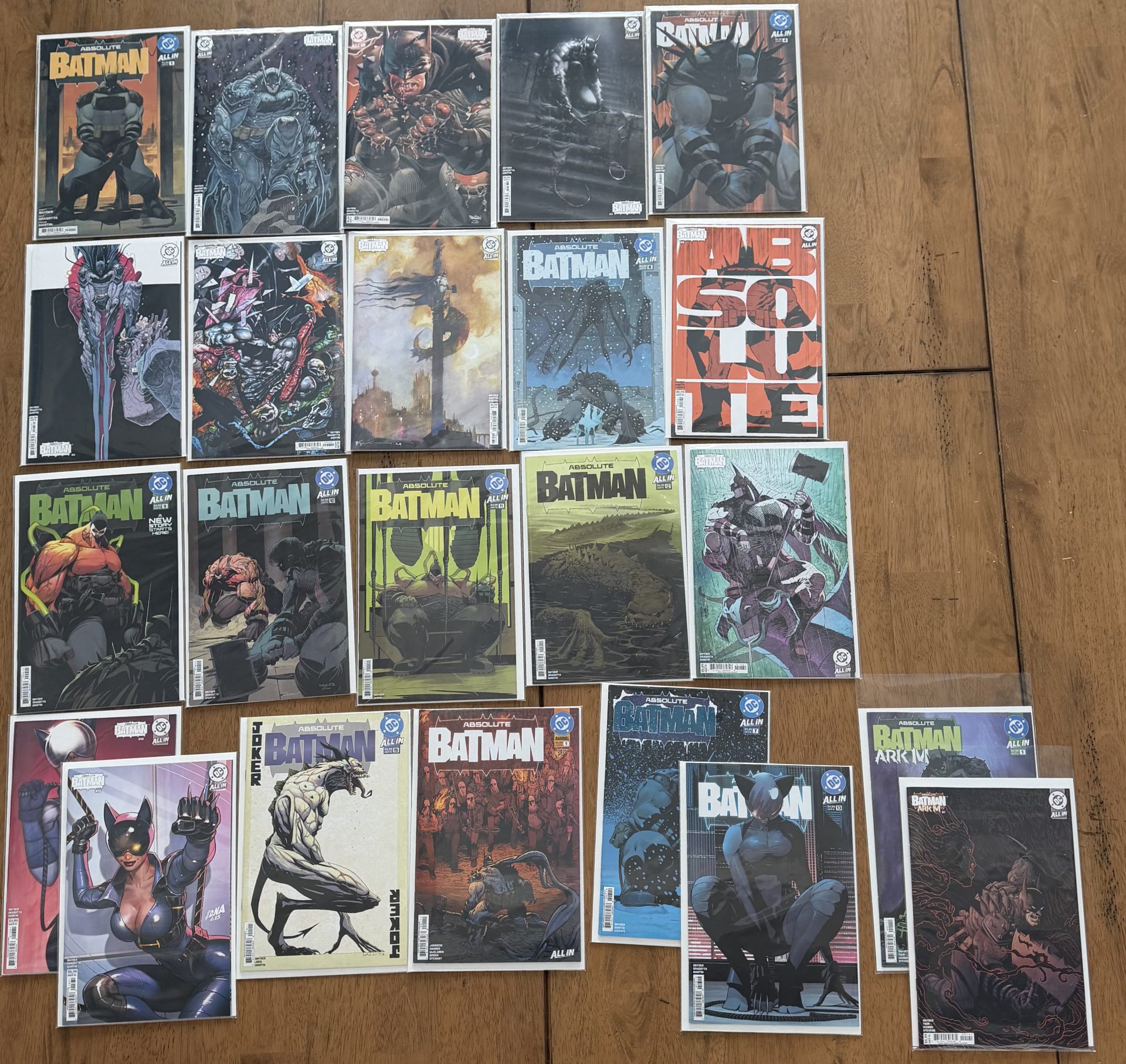 Absolute Batman #1A, #1 Retailer Incentive 1:25 Bertram Variant, #2E Panosian Variant, #3C Dell’Otto Variant, #4A, #5C Bertram Variant, #6C Bisley Variant, #7A, #7C Sienkiewicz Variant, 8A, 8B Redondo Variant, #9A, #10A, #11A, #12A, #13A, #13C Frison Variant, #13E Nakayama Variant, #14C March Variant, #15A, Annual #1A, Ark M #1A, and Ark M #1D Skroce Variant