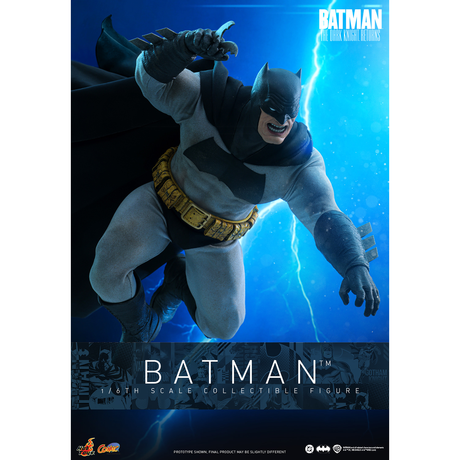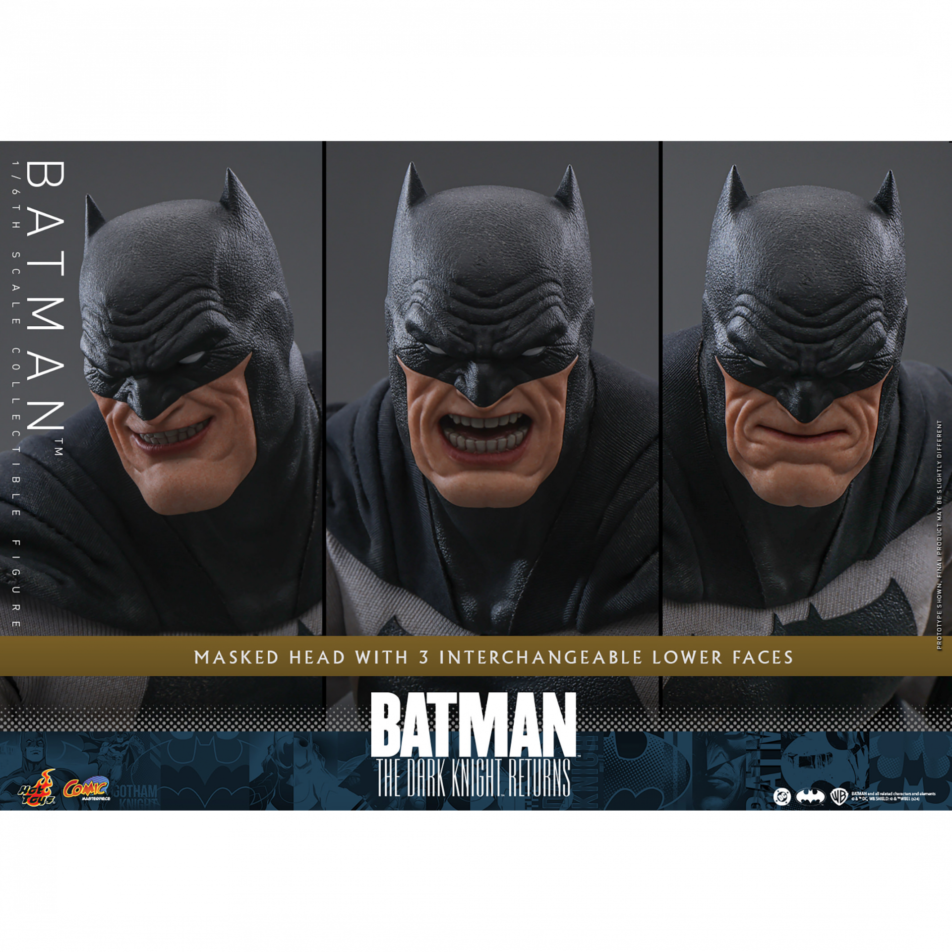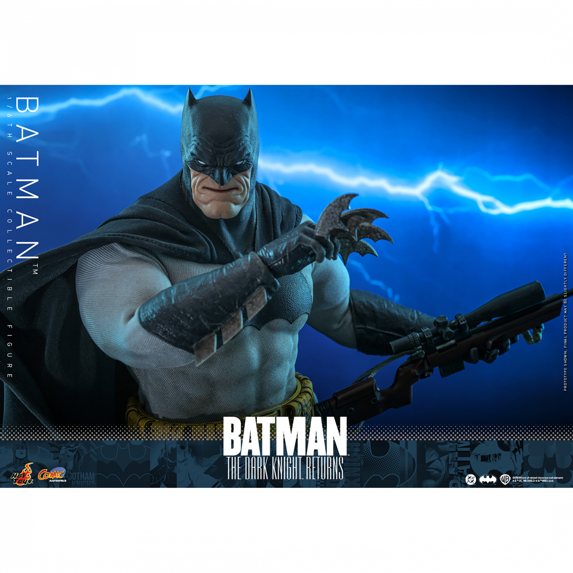Inspired by Batman’s appearance in “Batman: The Dark Knight Returns,” this meticulously crafted sixth scale figure features a newly developed body with 30 points of articulation that portrays Batman’s muscular physique, and a masked head with interchangeable lower parts of face. The collectible figure also comes with a specially tailored Batsuit with a large Bat symbol and an attached wired cape, a utility belt with weathering effects, Batarangs, a rifle and a specially designed figure stand with character nameplate.