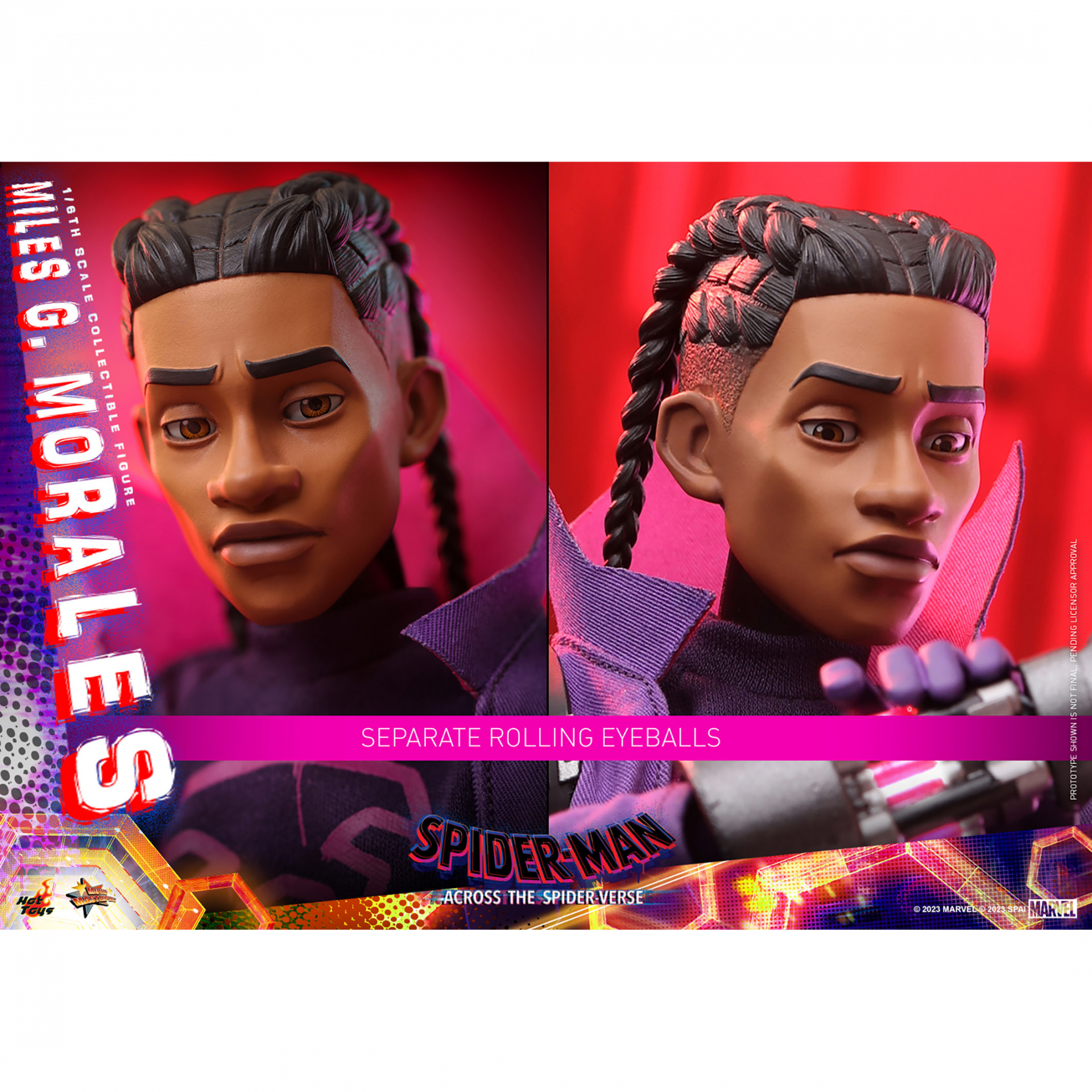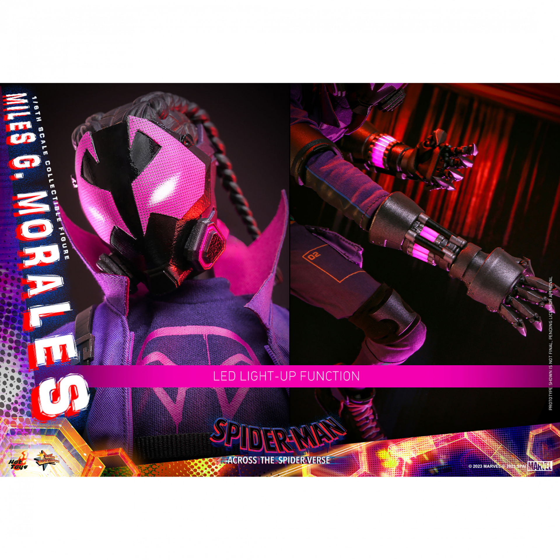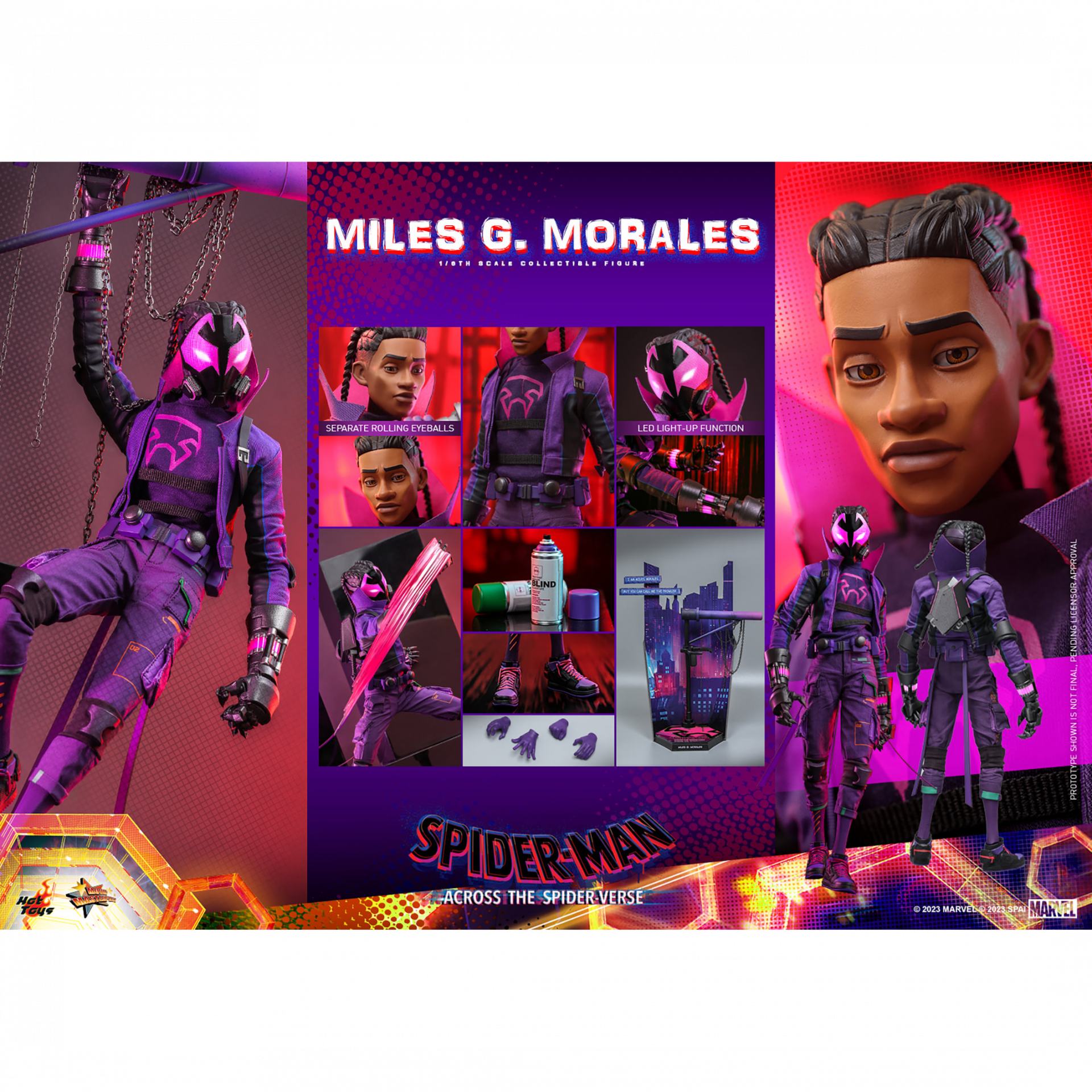 The highly-detailed sixth scale figure includes a newly developed head sculpt with separate rolling eyeball system and a masked head with LED light-up function in purplish red. His futuristic outfit in purple tone is beautifully recreated through a mixed media costume, from the jacket with tall standing collar, backpack, printed shirt, pants and the sculpted utility belt. The figure also includes a pair of LED-lighted Prowler gauntlets and sneakers with luminous reflective effect to complete his look as seen in movie. More detailed accessories include spray cans, gauntlet claw attacking effect, comic art backdrop, a pipe pole with chains as diorama accessory, and a themed figure stand.